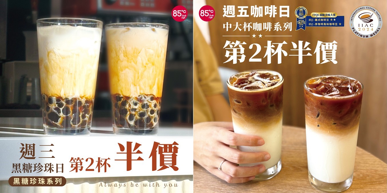 ▼85度C今週三黑糖珍珠日,黑糖珍珠系列第2杯半價。週五咖啡日,中大杯咖啡第2杯半價(含鉑金咖啡)。(圖/翻攝《85度C》粉專)