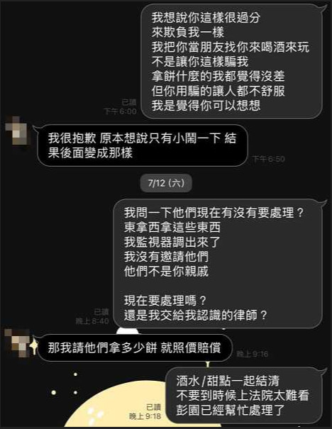 根據《三立新聞》報導,這名新娘傳訊息向航空業朋友抱怨,「我把你當朋友找你來喝酒來玩,不是讓你這樣騙我」,對方則道歉:「我很抱歉,原本想說只有小鬧一下,結果後面變這樣」,並承諾7月20日前賠償相關費用共16792元,但是到現在遲遲沒匯款。