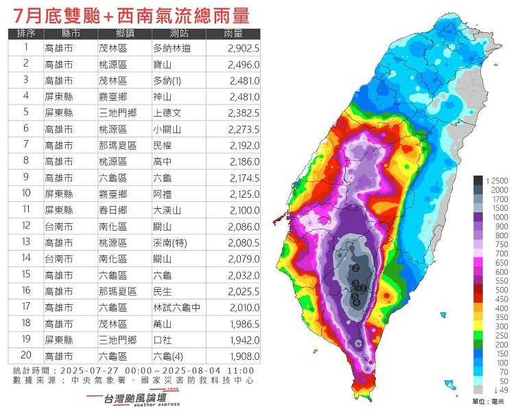 氣象粉專「台灣颱風論壇|天氣特急」指出,連日降雨,高雄山區達2900毫米雨量。7月底的雙颱環伺,緊接著好多天的西南氣流,中、南部地區下了一個多禮拜的雨,將近9天半的時間,雨量第1名在高雄多納林道2909毫米,另有16個測站也達2000毫米以上,非常驚人。