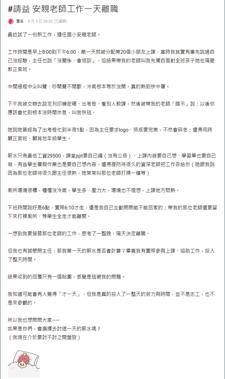 女網友3日在《Dcard》論壇PO文「安親老師工作一天離職」,她表示自己上班首日就被安排獨自帶20名小朋友,教室內吵吵鬧鬧,冷氣也像沒開,「中間過程中尖叫聲、吵鬧聲不間斷,冷氣根本等於沒開,真的熱到快中暑」,帶她的老師暗示會忙到沒時間休息,為出考券忙到半夜1點,同時還要顧「正音班與其他年級生」,好心提醒要她快逃。