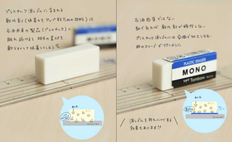 因此橡皮擦外頭的紙套才應運而生,貼文中解釋,「紙不是石油衍生物,軟化劑不會轉移到紙上」,有效避免橡皮擦與其他物品黏在一起,甚至無法使用的情形,成功延長橡皮擦使用壽命,使其效果能好好發揮。