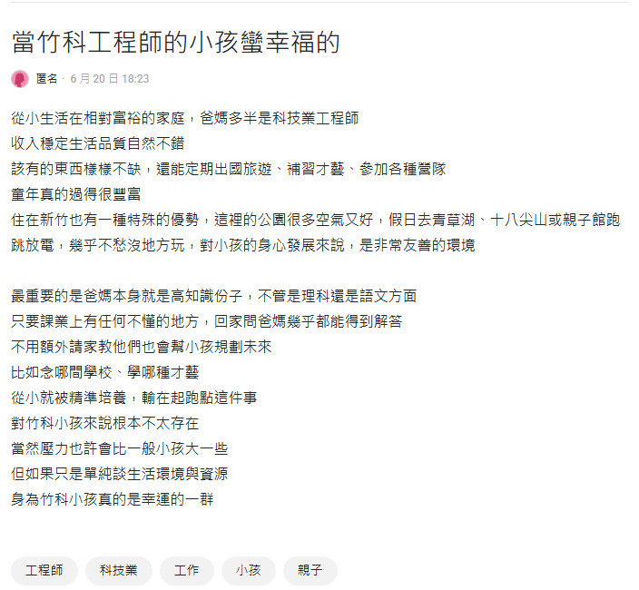 女網友在《Dcard》論壇PO文「當竹科工程師的小孩蠻幸福的」,她表示竹科小孩從小生活在相對富裕的家庭,爸媽多半是科技業工程師,該有的東西樣樣不缺,還能定期出國旅遊、補習才藝、參加各種營隊童年真的過得很豐富,且新竹號稱宜居城市,有一種特殊的優勢,她寫道:「公園很多、空氣又好,假日去青草湖、十八尖山或親子館跑跳放電,幾乎不愁沒地方玩,對小孩的身心發展來說,是非常友善的環境」。