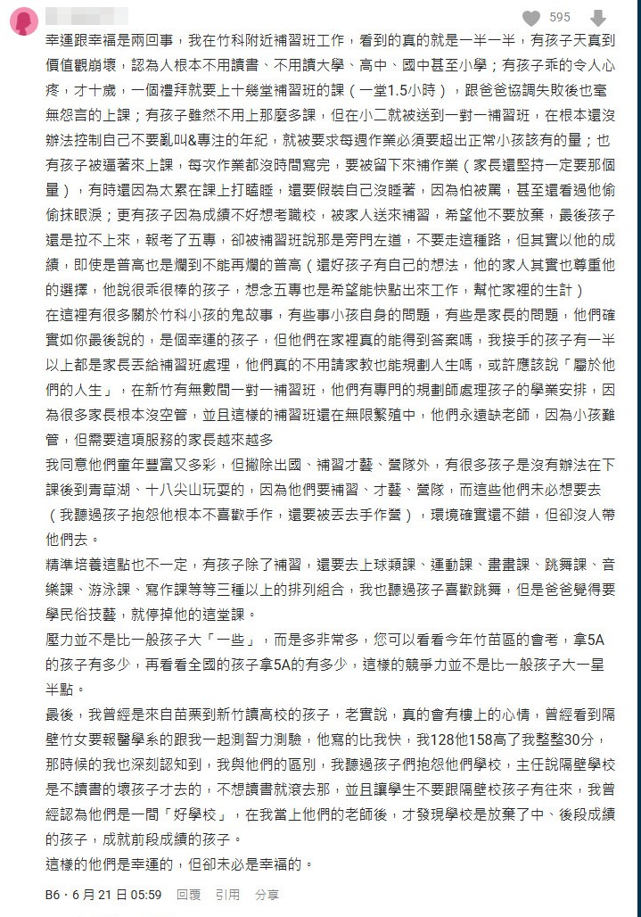 還有一名補教女師回文,直呼「幸運跟幸福是兩回事」,她寫道:「我在竹科附近補習班工作,看到的真的就是一半一半,有孩子天真到價值觀崩壞,認為人根本不用讀書;有孩子乖的令人心疼,才十歲,一個禮拜就要上十幾堂補習班的課。小二就開始送到一對一補習班,作業超出正常小孩的量。」