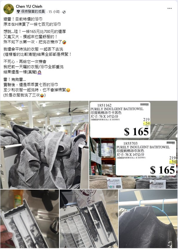 女網友20日在《Costco好市多 商品經驗老實說》社團發文,她寫道:「避雷!目前特價的浴巾,原本在H牌買了一條七百元的浴巾,想說…哇!一條165元比700元的還厚。又寬又大,摸起來也蠻舒服的!」未料一下水卻是她噩夢的開始,她寫道:「殊不知下水第一次,把洗衣機炸了,我還拿平時洗的衣服一起丟下去洗,結果全部都是棉絮!不死心,再給它一次機會,我把前一天曬的衣服、浴巾全部重洗,結果還是一樣,真鬧!」