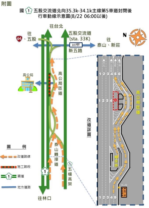 為配合「國道1號五股交流道增設北入及北出匝道改善工程」北向出口平面匝道拓寬段通車,交通部高速公路局第一新建工程分局宣布,自明(22)日清晨6時起,國1主線34公里+700至34公里+100第五車道(高速公路局前方路段,約600公尺)將永久封閉。往五股、泰山方向的用路人,須提前於37公里處靠右行駛外側2車道。
