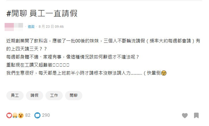 一名飲料店老闆娘在《Dcard》論壇上PO文「員工一直請假」,她表示近期創業開了飲料店,應徵了一批00後的妹妹,但卻面臨經常告假的問題,她表示現在工讀又超難徵,加上生意很好,每天都是上班前半小時才請根本沒辦法調人力快暈倒,她寫道:「3個人不斷輪流請假(頻率大約每週都會請)有的上4天請3天??每週都身體不適、家裡有事,像這種情況該如何辭退才不違法呢?」