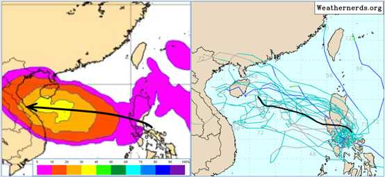 ▼吳德榮說明,最新歐洲系集模式模擬顯示,今熱帶擾動進入南海,週四、週五緩慢發展,成颱機率約40%;最新美國系集模式模擬顯示,系集平均(粗黑)路徑偏西北西進行,個別模擬路徑則相當分散、且強度偏弱。(圖/翻攝自氣象應用推廣基金會)