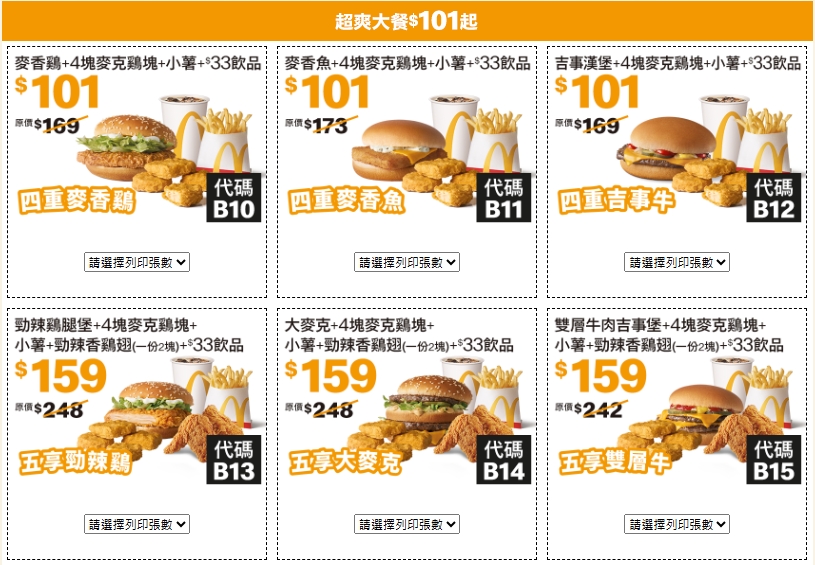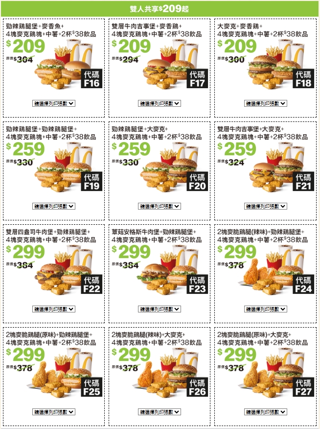 個人套餐四件組101元起,包括麥香雞、麥香魚或吉事漢堡(任選)+4塊麥克雞塊+小薯+33元飲品;五件組159元,含勁辣雞腿堡、大麥克或雙層牛肉吉事堡(任選)+4塊麥克雞塊+小薯+勁辣香雞翅+33元飲品。雙人共享套餐209元起,提供雙主餐(含蕈菇安格斯牛肉堡、大麥克等)+4塊麥克雞塊+中薯+2杯38元飲品。