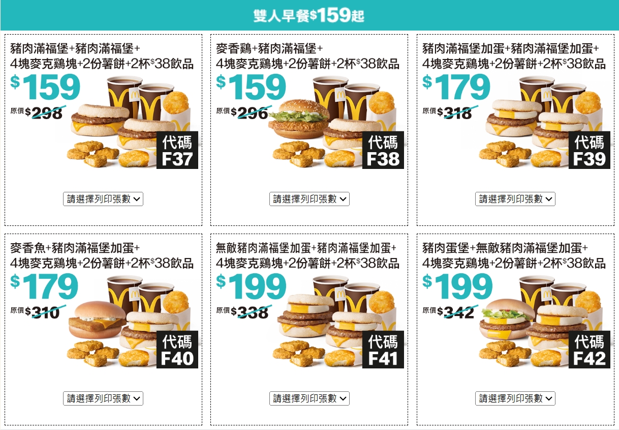 早餐時段指定套餐免費升級咖啡,雙人早餐159元起,包含豬肉滿福堡加蛋、麥香魚等+4塊麥克雞塊+2份薯餅+2杯38元飲品,最高下殺近5折。