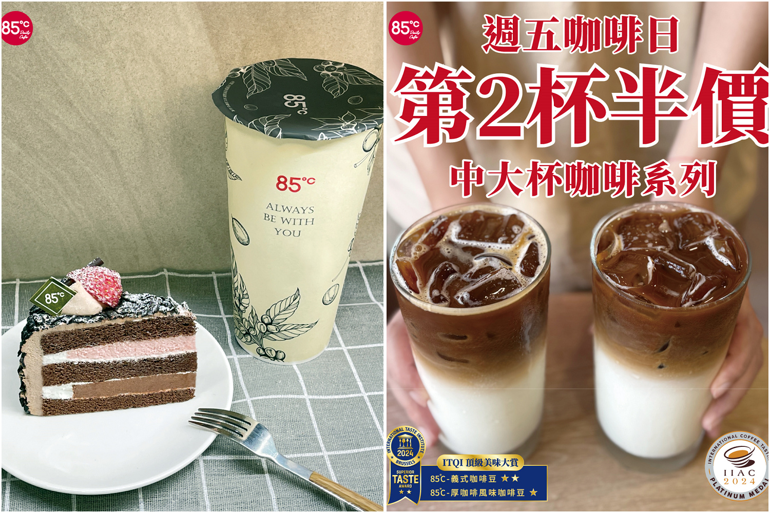 第2杯半價:85度C「週五咖啡日」,中大杯咖啡,不分冷、熱,通通第2杯半價。