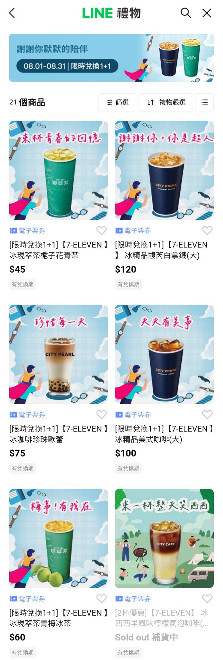 ▼LINE禮物推出7-11電子票券,眾多咖啡、茶飲通通「買1送1」。(圖/翻攝《LINE禮物》)