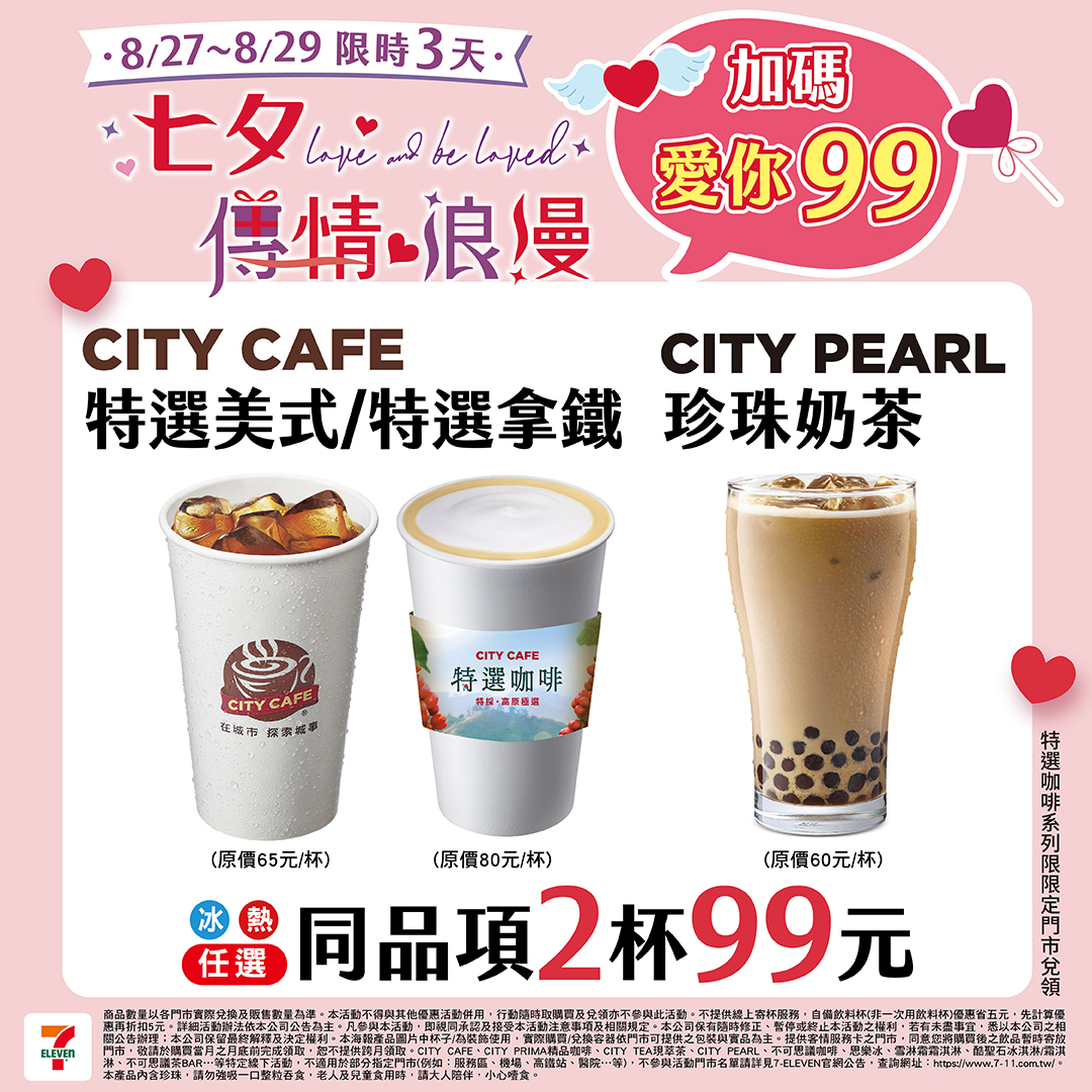 ▼7-11七夕情人節門市推出「愛你99」咖啡優惠,特選美式、特選拿鐵、珍珠奶茶,通通2杯99元。(圖/翻攝《7-ELEVEN》粉專)