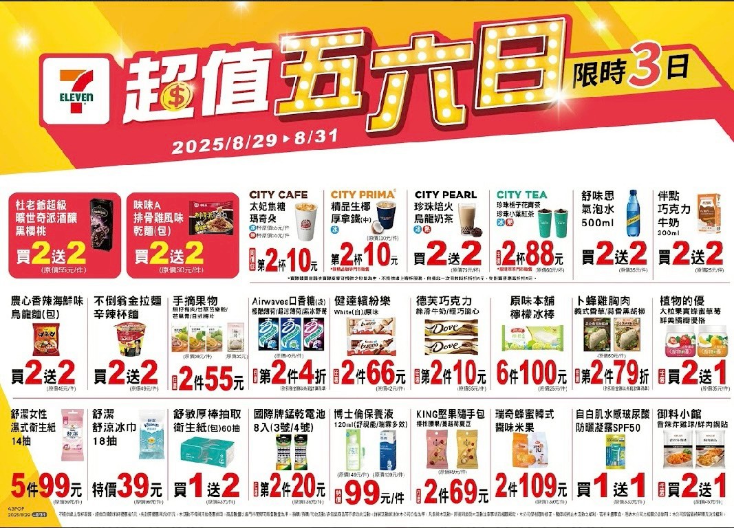 ▼7-11超值五六日,限時3日寄出飲料、餅乾、零食、泡麵等優惠。(圖/業者提供)