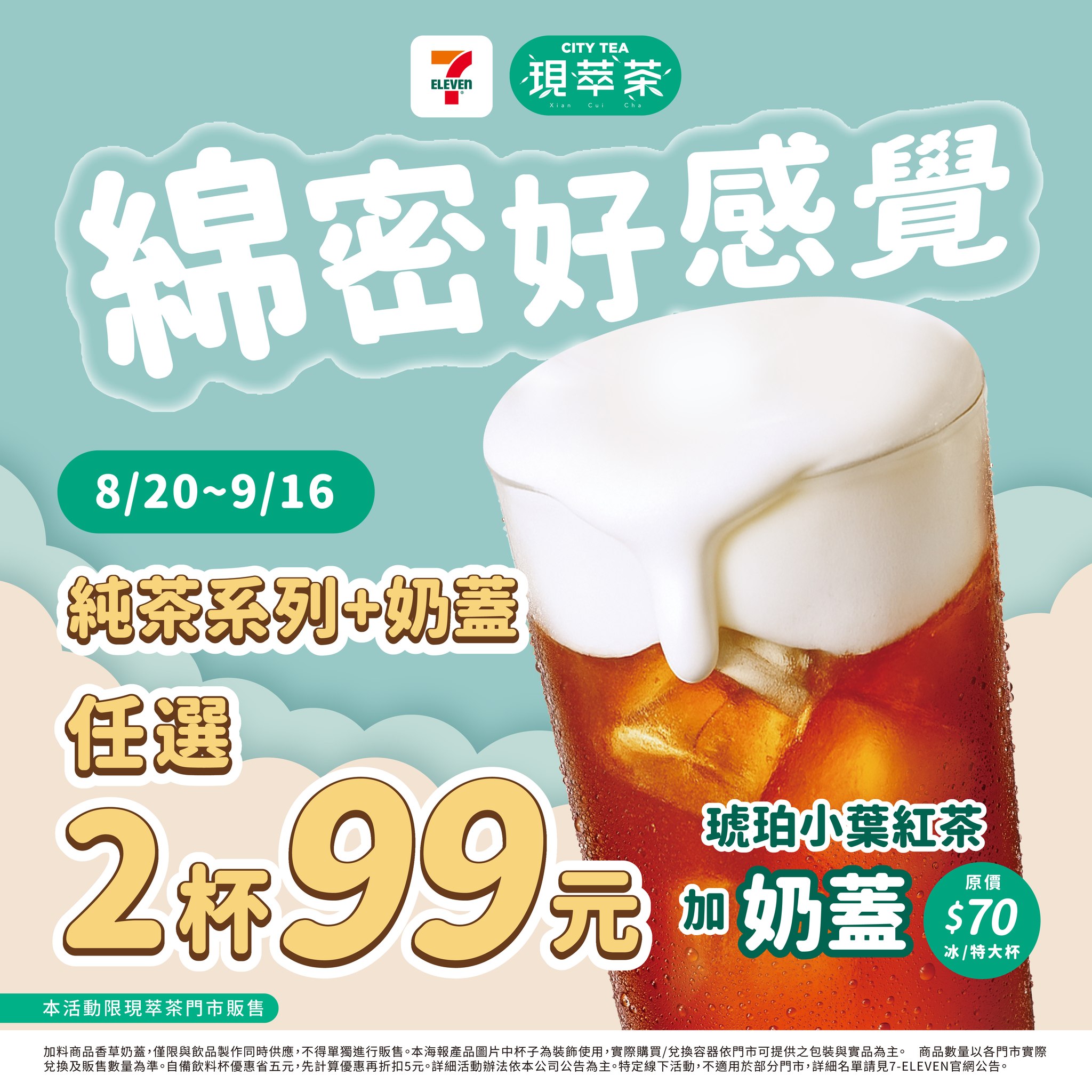 ▼CITY TEA現萃茶「純茶系列+香草奶蓋」,任選2杯99元。(圖/翻攝《7-ELEVEN》粉專)