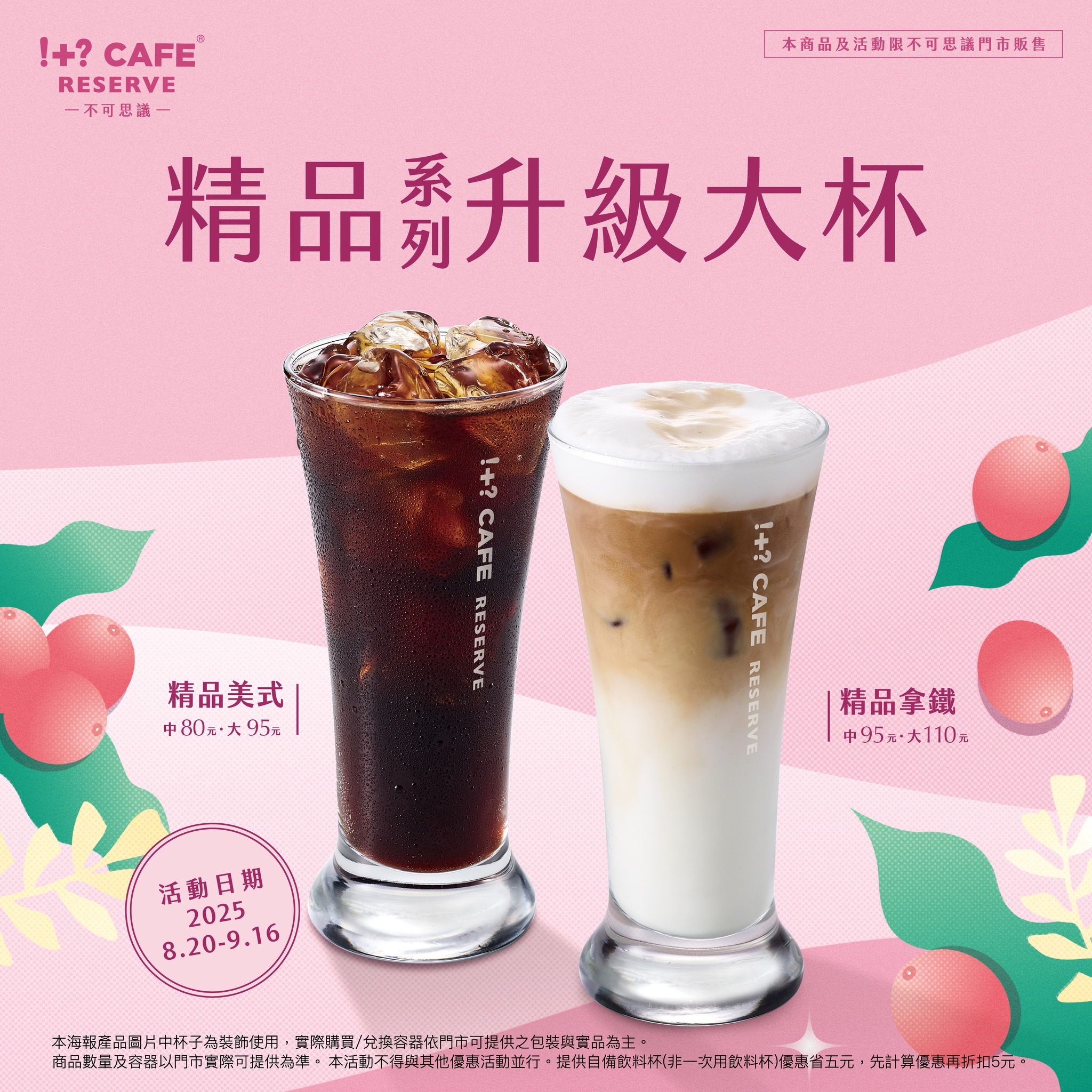 精品拿鐵咖啡免費升級大杯,8.6折(原價110元、特價95元)