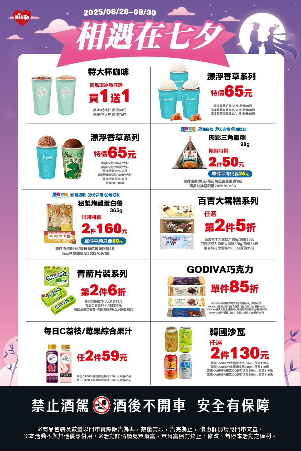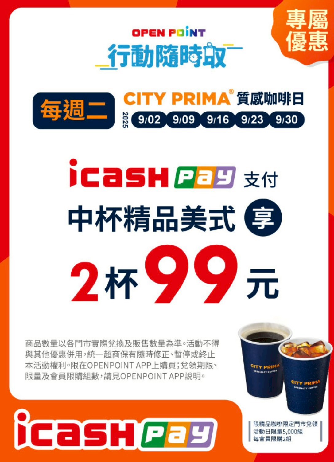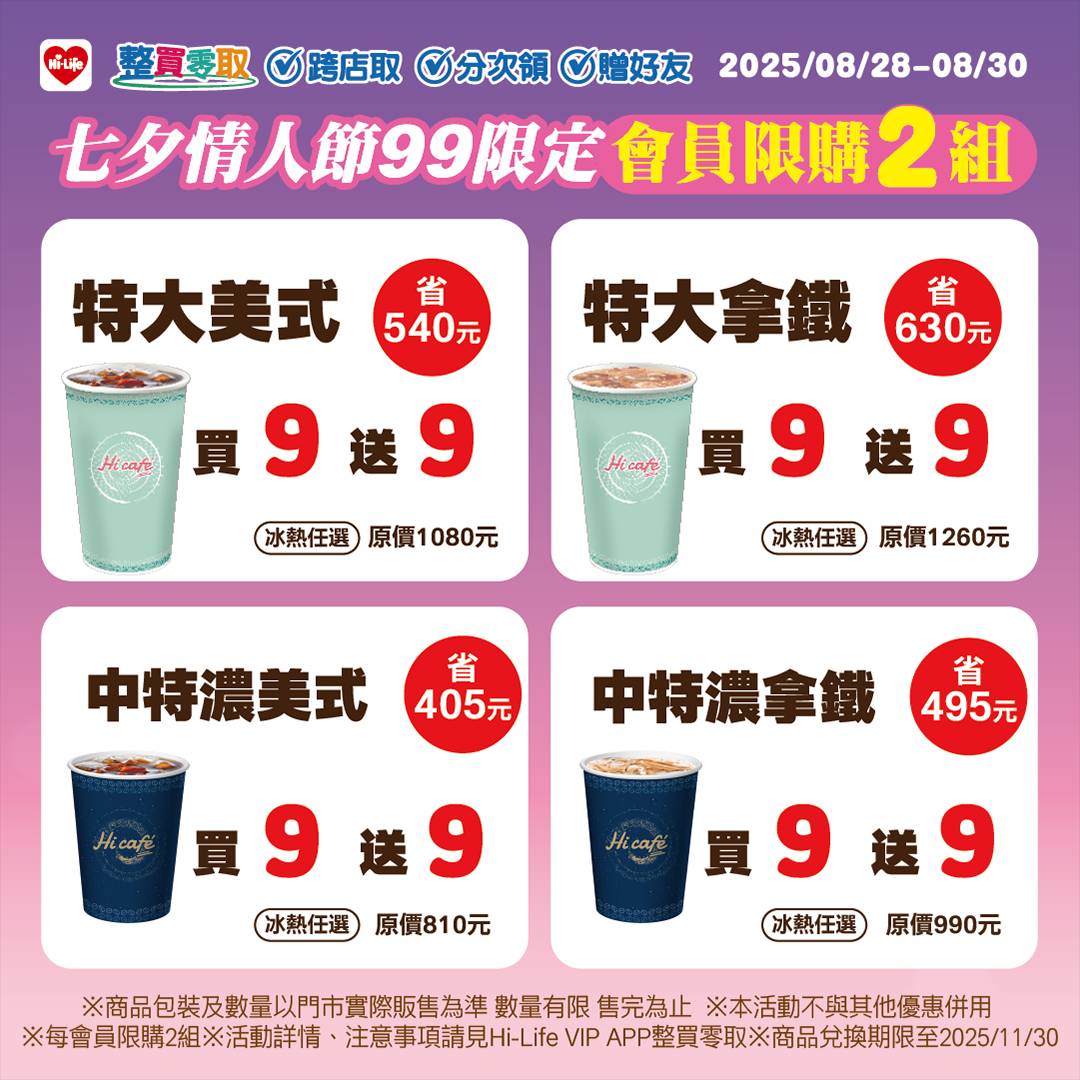 另外,4大超商也祭出咖啡優惠,7-11今起精品生椰拿鐵第2杯10元、烏龍奶茶買2送2,9月1日起還有7-11寄杯精品咖啡買7送7;全家燕麥奶拿鐵2杯99元、特大阿里山高冷烏龍加10元多1杯。萊爾富大杯美式買49送50,4.9折,比半價還便宜,1杯只要22元!OK超商則於9/1推出大杯莊園美式、莊園美式、極淬莊園美式、極淬莊園拿鐵,通通買2送2。「LINE禮物」有7-11電子票券精品美式、馥芮白拿鐵買1送1。
