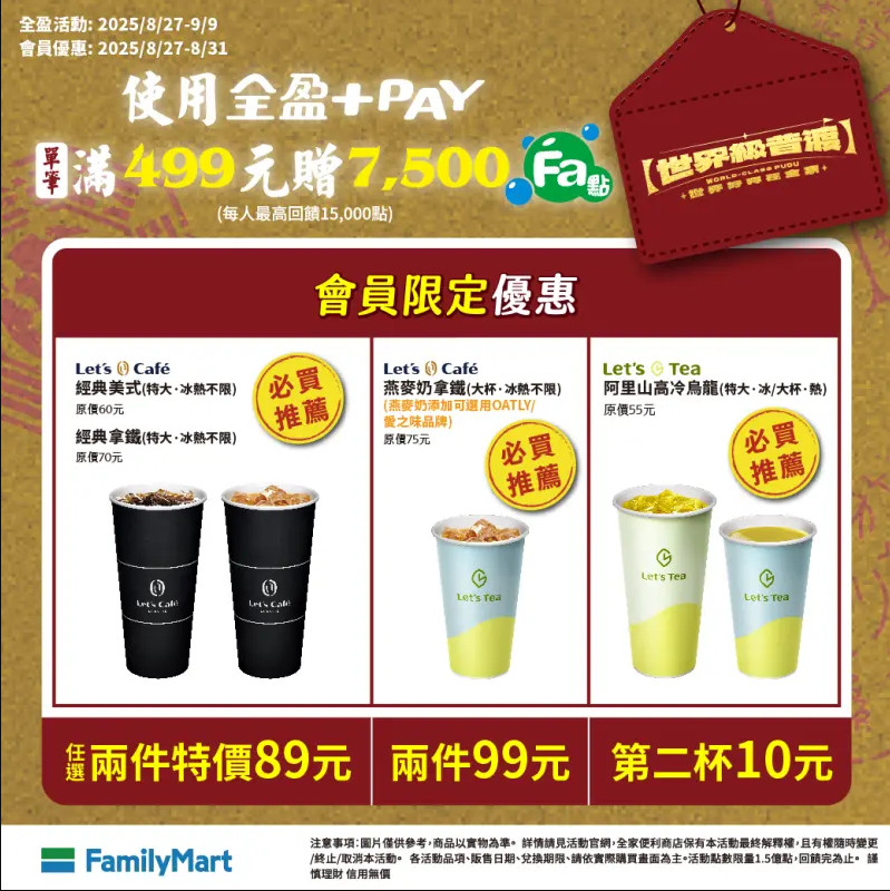 ▼全家會員使用全盈+PAY,特大拿鐵加19元多一杯、特大美式加29元多一杯、燕麥奶拿鐵2杯99元、特大阿里山高冷烏龍加10元多一杯。(圖/翻攝《全家》粉專)