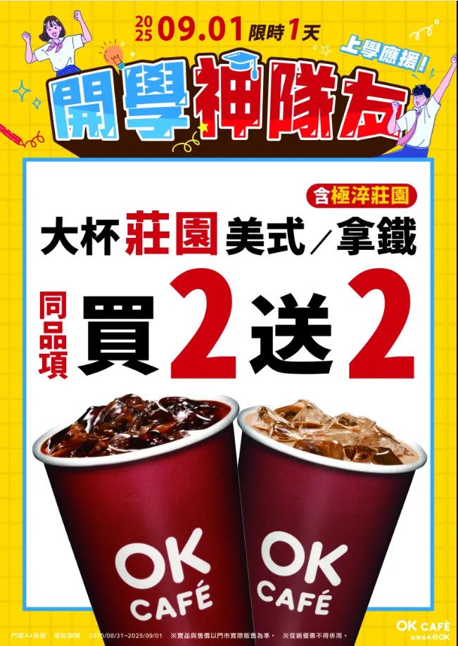 ▼OK超商9/1祭出大杯莊園美式、大杯莊園拿鐵、大杯極淬莊園美式、大杯極淬莊園拿鐵,通通買2送2優惠。(圖/業者提供)