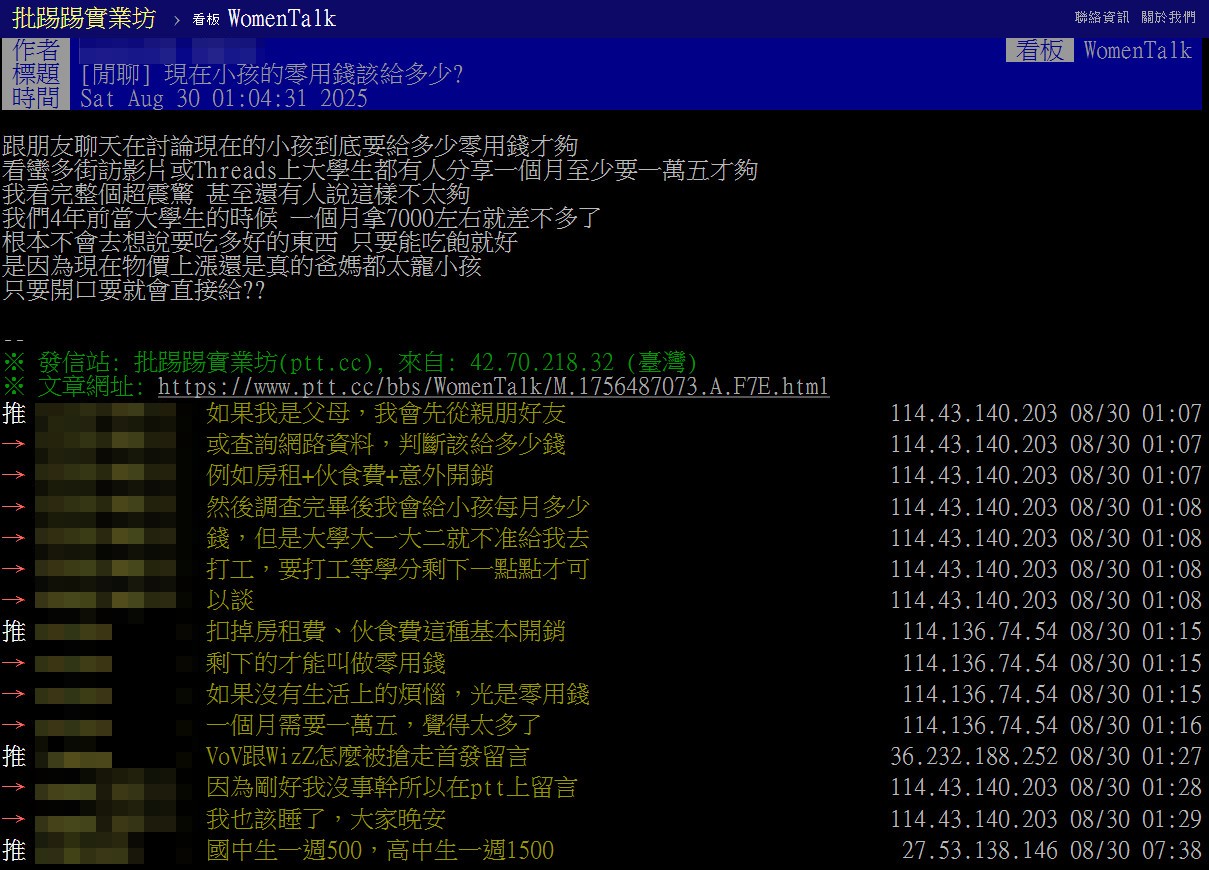 女網友在《台大批踢踢》女板發文「現在小孩的零用錢該給多少?」她表示看到蠻多街訪影片,或Threads上大學生都有人分享,「1個月至少要1萬5才夠」,讓她相當吃驚。她寫道:「我看完整個超震驚,甚至還有人說這樣不太夠。我們4年前當大學生的時候,1個月拿7000元左右就差不多了。根本不會去想說要吃多好的東西,只要能吃飽就好。」她忍不住問大家是不是太寵孩,「是因為現在物價上漲,還是真的爸媽都太寵小孩,只要開口要就會直接給?」
