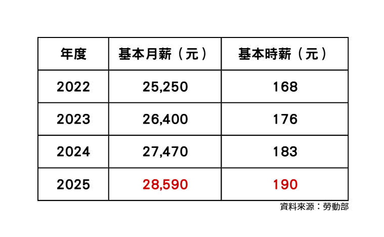 值得一提的是,從2022年1月1日開始,基本月薪就已調至2萬5250元、時薪168元;2023年基本月薪來到2萬6400元、時薪176元;2024年又再調,變為2萬7470元、183元;而2025年最低工資已調至2萬8590元、190元。