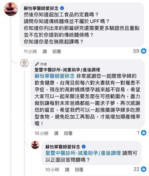 蘇怡寧醫師痛批,胡說八道就算了,已經好意提醒對方還執迷不悟,隨便引用一篇證據力不高的問卷研究來亂說一通,「問題是人家在說ultra processed food超加工食品,重點是一般麵條根本不屬於UPF,而且人家也沒說吃麵食胎兒會沒有心跳啊」,砲轟造謠一張嘴、闢謠跑斷腿,世界會這麼混亂,這些人多少都要負一點責任。