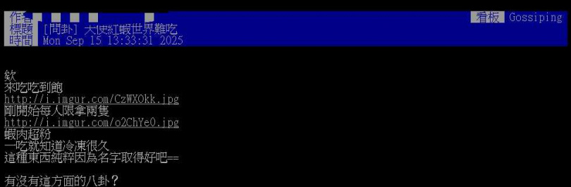 ▼網友在Buffet餐廳排隊領取限量供應的天使紅蝦,實際品嘗後卻反映口感鬆散不佳,引發討論。(圖/翻攝自PTT)