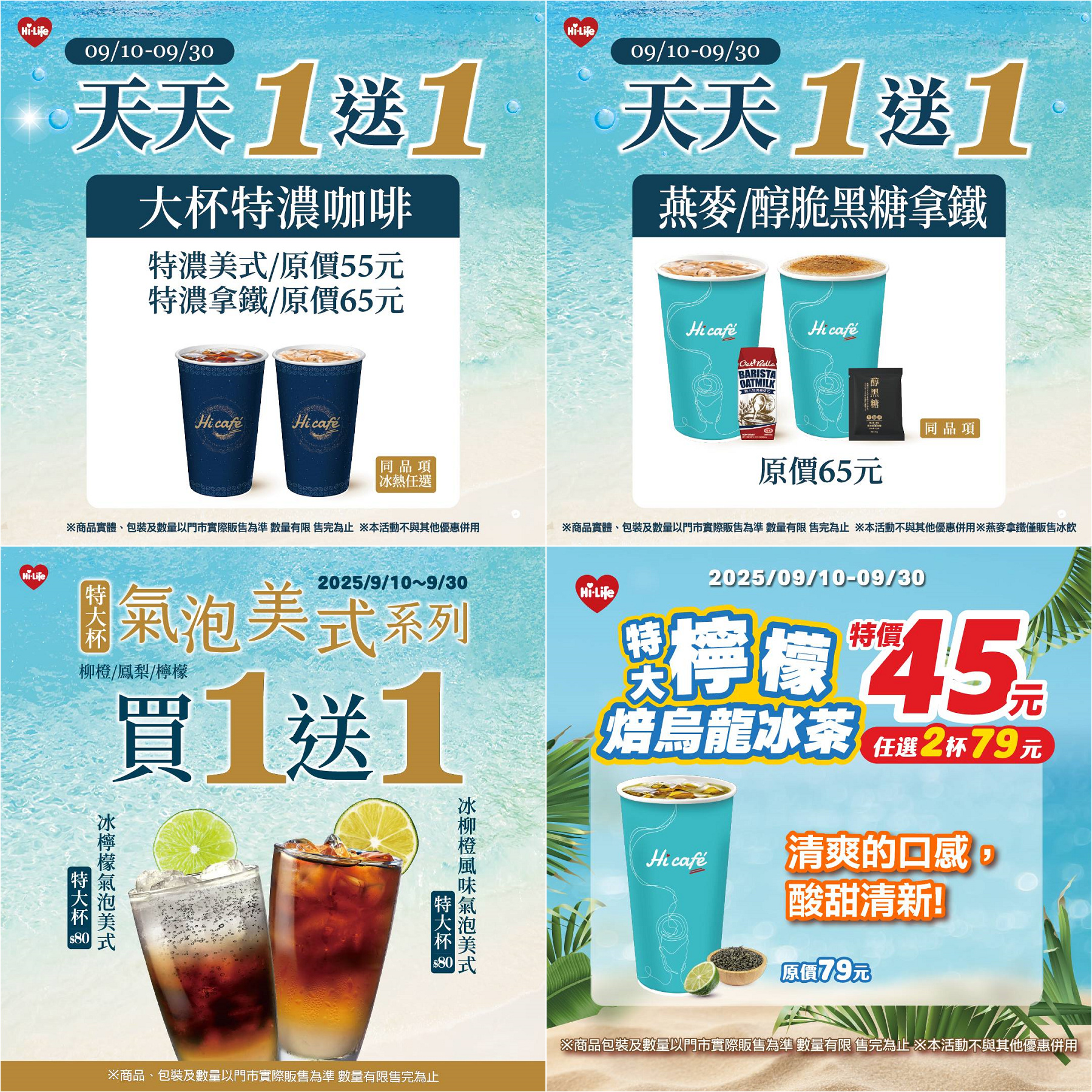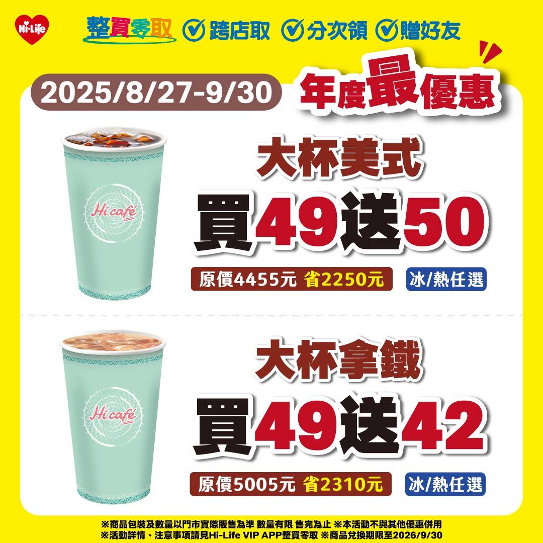 ▼萊爾富Hi café超值優惠,大杯特濃美式、大杯特濃拿鐵、燕麥拿鐵、醇脆黑糖拿鐵、特大杯冰氣泡美式系列(檸檬/柳橙/鳳梨),通通「買1送1」。(圖/翻攝《萊爾富》粉專)