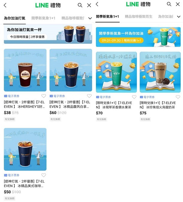 ▼LINE禮物推出7-11電子票券,可可、拿鐵、美是、水果茶,烏龍奶茶通通「買1送1」。(圖/翻攝《LINE禮物》)