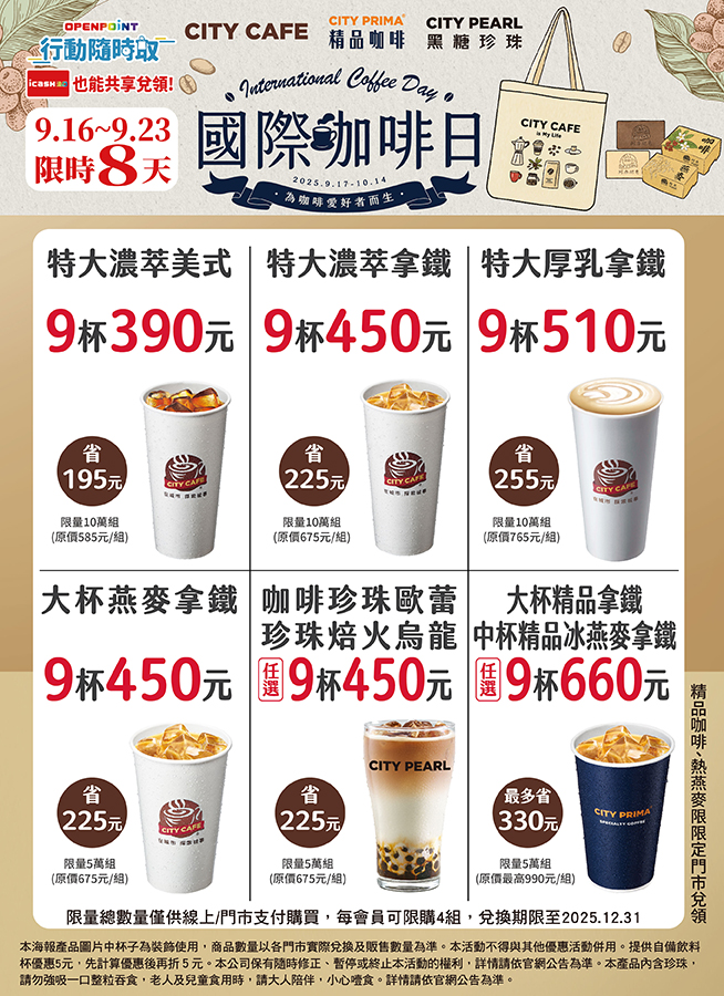 特大濃萃拿鐵9杯450元,6.6折(原價75元、特價50元)