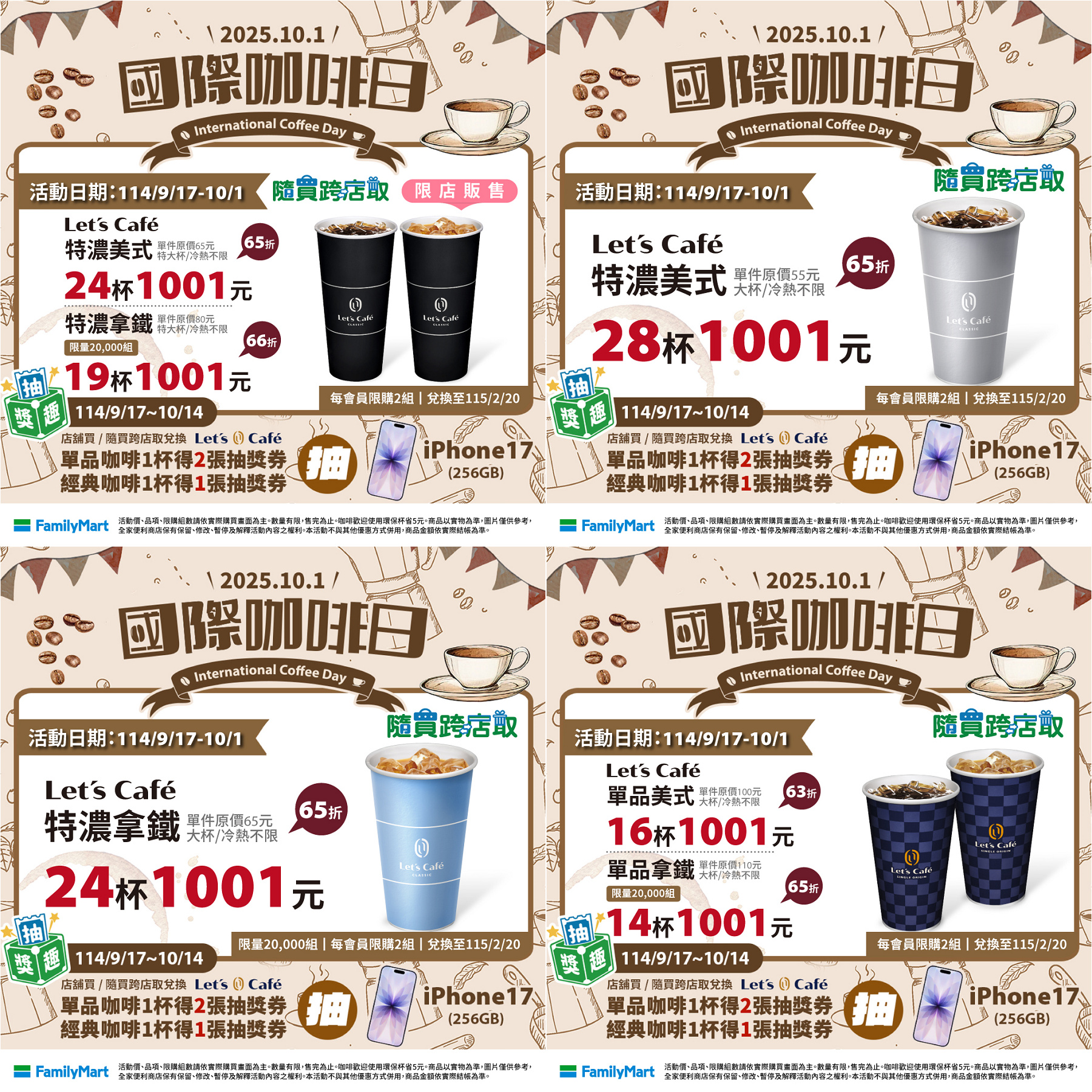 ▼全家國際咖啡日,推出特大杯特濃美式24杯、特大杯特濃拿鐵19杯、大杯特濃美式28杯、大杯特濃拿鐵24杯、大杯單品美式16杯、大杯單品拿鐵14杯,通通「組合價1001元」。(圖/翻攝《全家》粉專)