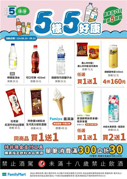 ▼全家5康康,推出一系列泡麵、零食、咖啡、茶飲「買1送1」優惠。(圖/業者提供)