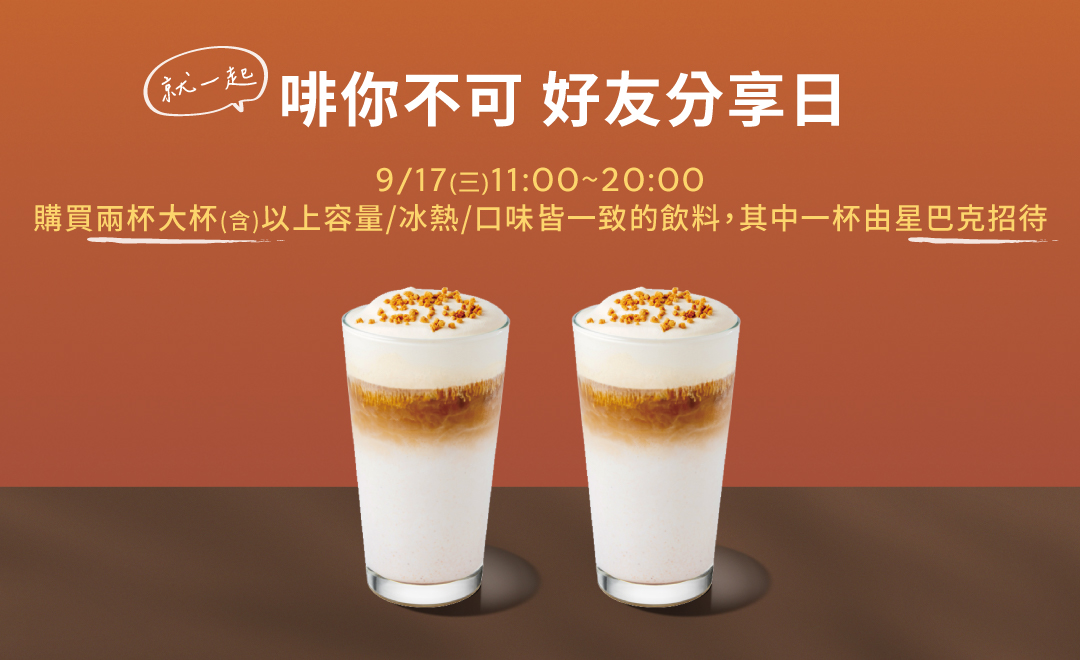 買1送1:星巴克「啡你不可好友分享日」,活動期間購買2杯大杯(含)以上容量/冰熱/口味皆一致的飲料,其中1杯由星巴克招待。每人每次至多買2送2,飲料限當場一次領取。換算下來,最便宜大杯星沁爽55元、美式57.5元、香草星冰樂62.5元。