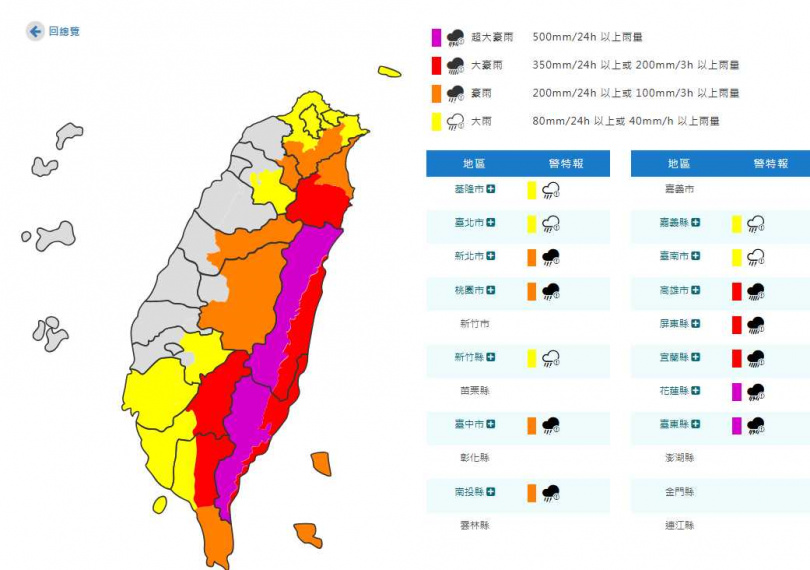 氣象署清晨也發布豪雨特報,23日花蓮縣及台東縣山區有局部大豪雨或超大豪雨;花蓮縣、台東縣地區及高雄市、宜蘭縣、屏東縣山區有局部豪雨或大豪雨;宜蘭縣地區、新北市山區、桃園市山區、台中市山區、南投縣山區、恆春半島及蘭嶼、綠島有局部大雨或豪雨;大台北、南部地區及新竹、嘉義山區有局部大雨發生的機率。