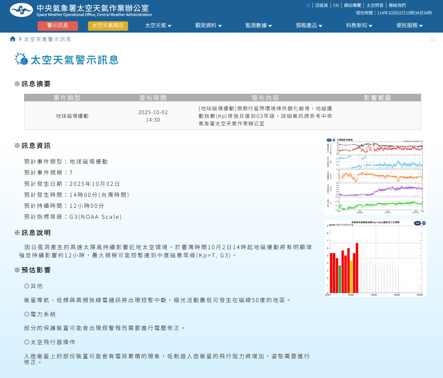 ▼中央氣象署太空天氣作業辦公室今日發布太空天氣警示,下午2時起地磁擾動長達12小時。(圖/翻攝《中央氣象署太空天氣作業辦公室》官網)