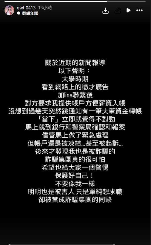 針對涉案事件,闕闕晚間透過IG發表聲明,稱大學時期曾在網路見到徵才廣告,依照指示加LINE聯繫後被要求提供帳戶,當時誤以為是正常的薪資入帳安排。幾天後卻接獲通知,有大額資金轉入,她立刻覺得有異並前往銀行與警局報案,但帳戶仍遭凍結,最終甚至被起訴。她強調自己同樣是詐騙的受害者,呼籲民眾警惕,「千萬不要隨意提供帳戶,以免被集團利用」。