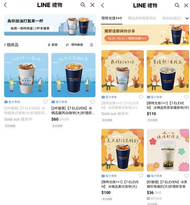 ▼LINE禮物推出7-11電子票券,週一加油打氣咖啡,大杯精品馥芮白、中杯冰精品燕麥拿鐵、大杯冰精品美式咖啡,通通「買1送1」。(圖/翻攝《LINE禮物》)