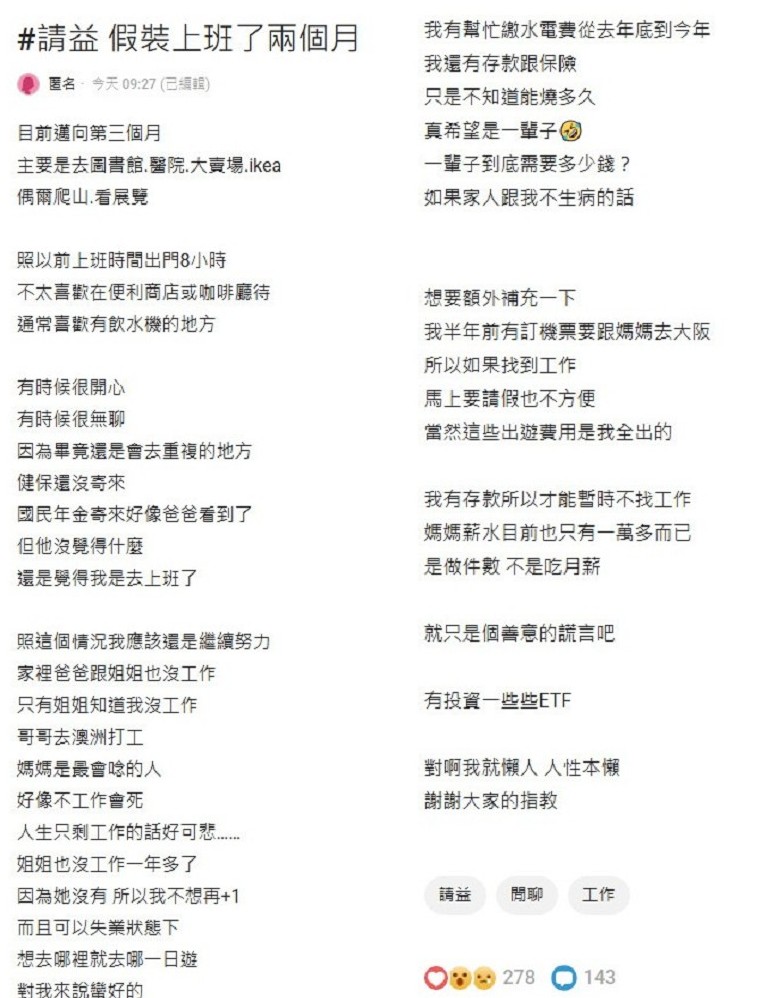 女網友在《Dcard》論壇PO文「假裝上班了2個月」,她表示失業邁向第3個月,她都照以前上班時間出門8小時,去圖書館、醫院、大賣場、ikea等有飲水機的地方耗時間,偶爾爬山、看展覽,目前全家僅母親靠論件計酬的薪水,月領約1萬多,哥哥在澳洲打工,父親、姐姐、和她都沒工作。
