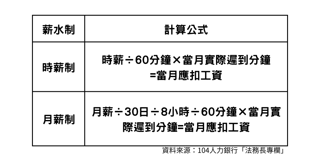 事實上,根據104人力銀行網站上的「法務長專欄」,蘇宏文律師曾針對類似情形說明,遲到扣薪水是有正確計算方式,如果是時薪制勞工,為「時薪÷60分鐘×當月實際遲到分鐘=當月應扣工資」,而月薪制勞工的話,則是「月薪÷30日÷8小時÷60分鐘×當月實際遲到分鐘=當月應扣工資」。