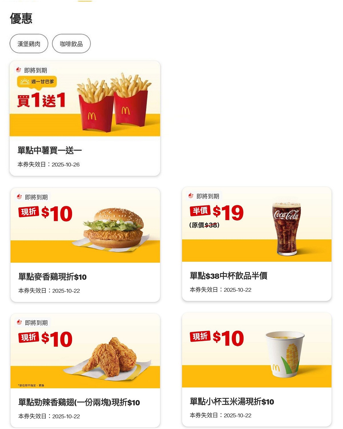 現折10元:單點麥香雞、單點「勁辣香雞翅(一份兩塊)」現折10元