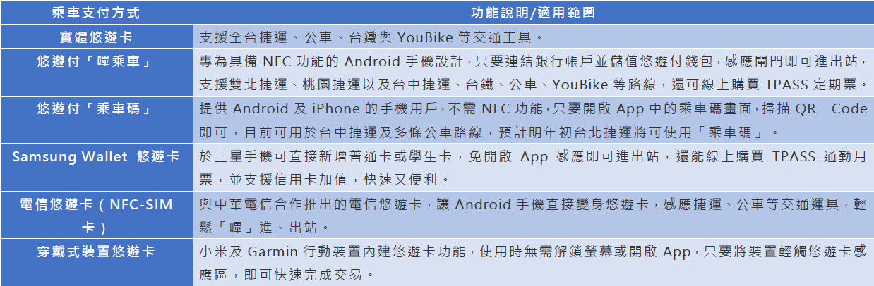 為提供民眾更多「嗶」進站的支付選擇,悠遊卡公司彙整目前可用於捷運、公車等交通場域的6種支付方式,除了實體悠遊卡外,還包括手機悠遊付的「嗶乘車」及「乘車碼」、三星Samsung Wallet悠遊卡、電信悠遊卡(NFC-SIM卡)以及小米、Garmin穿戴式裝置悠遊卡等多元支付方式任君選擇,讓通勤族「嗶」進站更加多元、便捷。