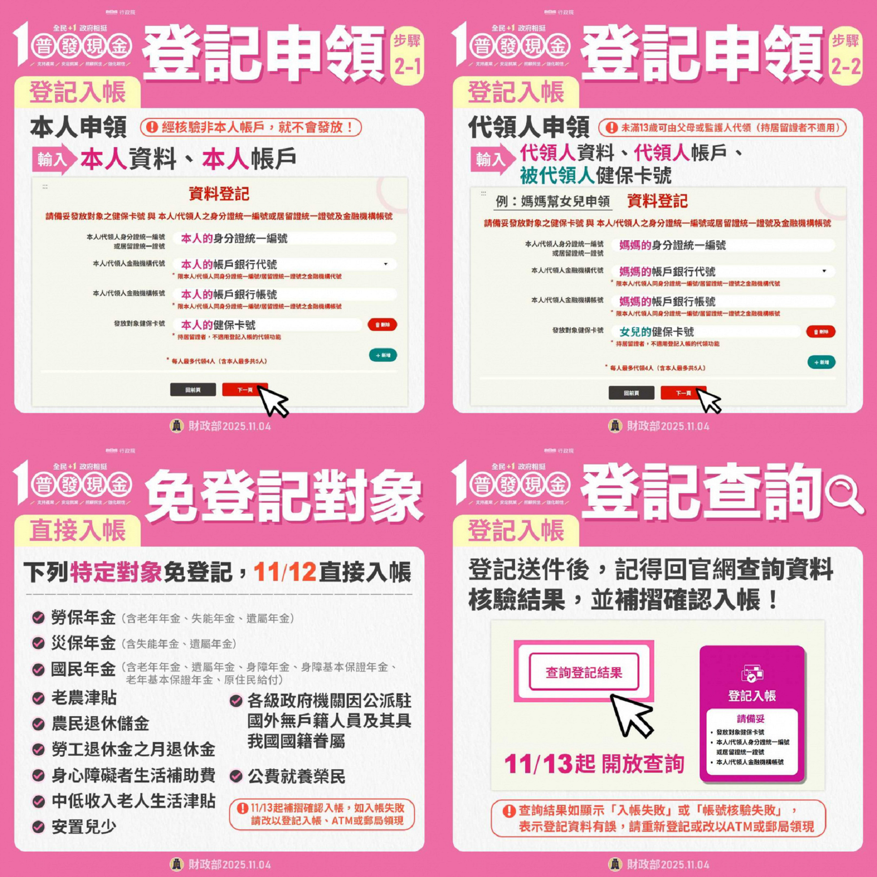財政部指出,凡於預登記期間及10日當天完成登記並經系統檢核成功者,款項將於11日18時起至12日依各銀行作業程序陸續入帳;11日以後登記成功者,於登記後2個營業日內入帳。