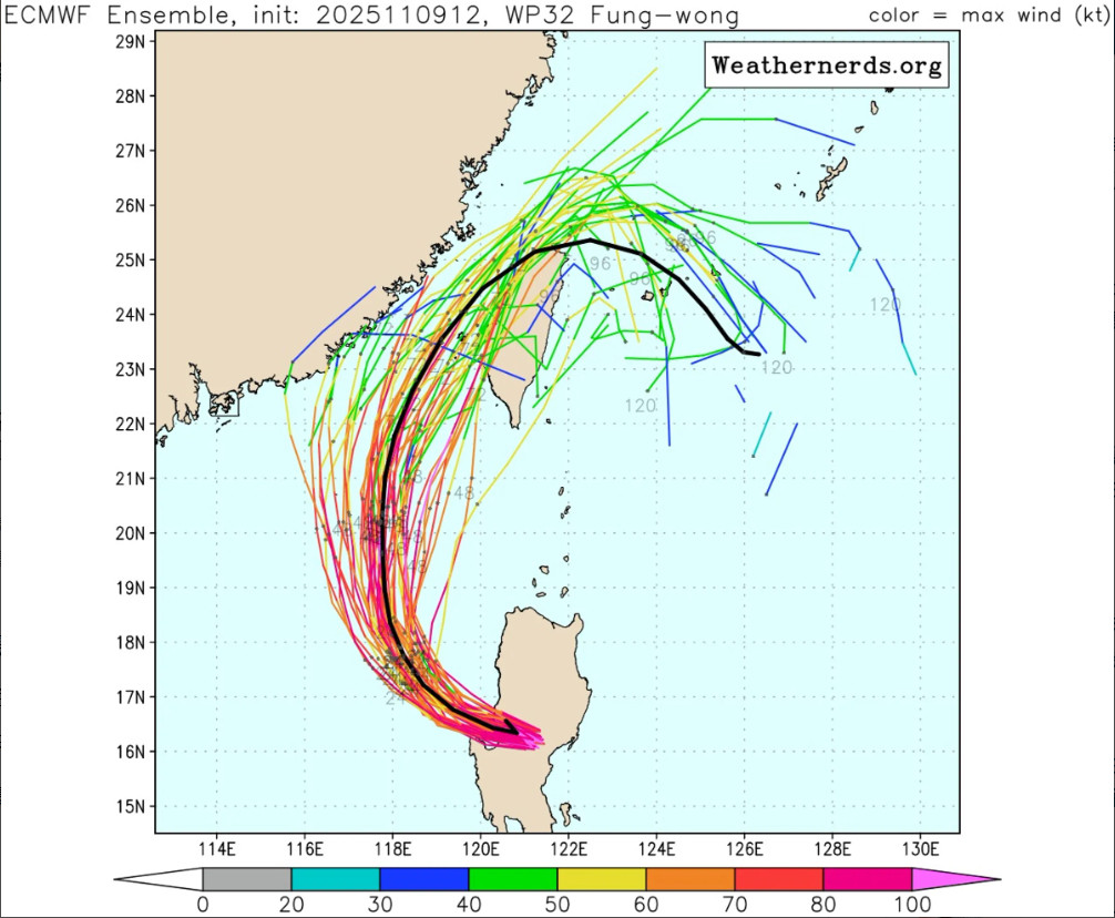 ▼最新歐洲系集模式模擬與顯示,鳳凰的系集平均路徑(粗黑線)通過呂宋島,在台灣西南方海面北轉,進入台灣海峽,侵襲台灣。(圖/翻攝自weathernerds)