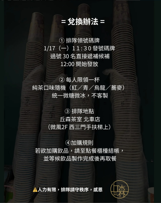 面對有部分網友再度質疑其真實性,手搖飲業者親自留言證實,「是真的!地理系學號b92學長已付清」「剛剛B972080xx學姊 加碼50杯」,業者也在自己的臉書粉專po文,「『台大大氣系祭品文,地理系霸氣出手」丘森茶室350杯手搖飲,等你來兌換」,並提到今天如何排隊領號碼牌及兌換相關規則。