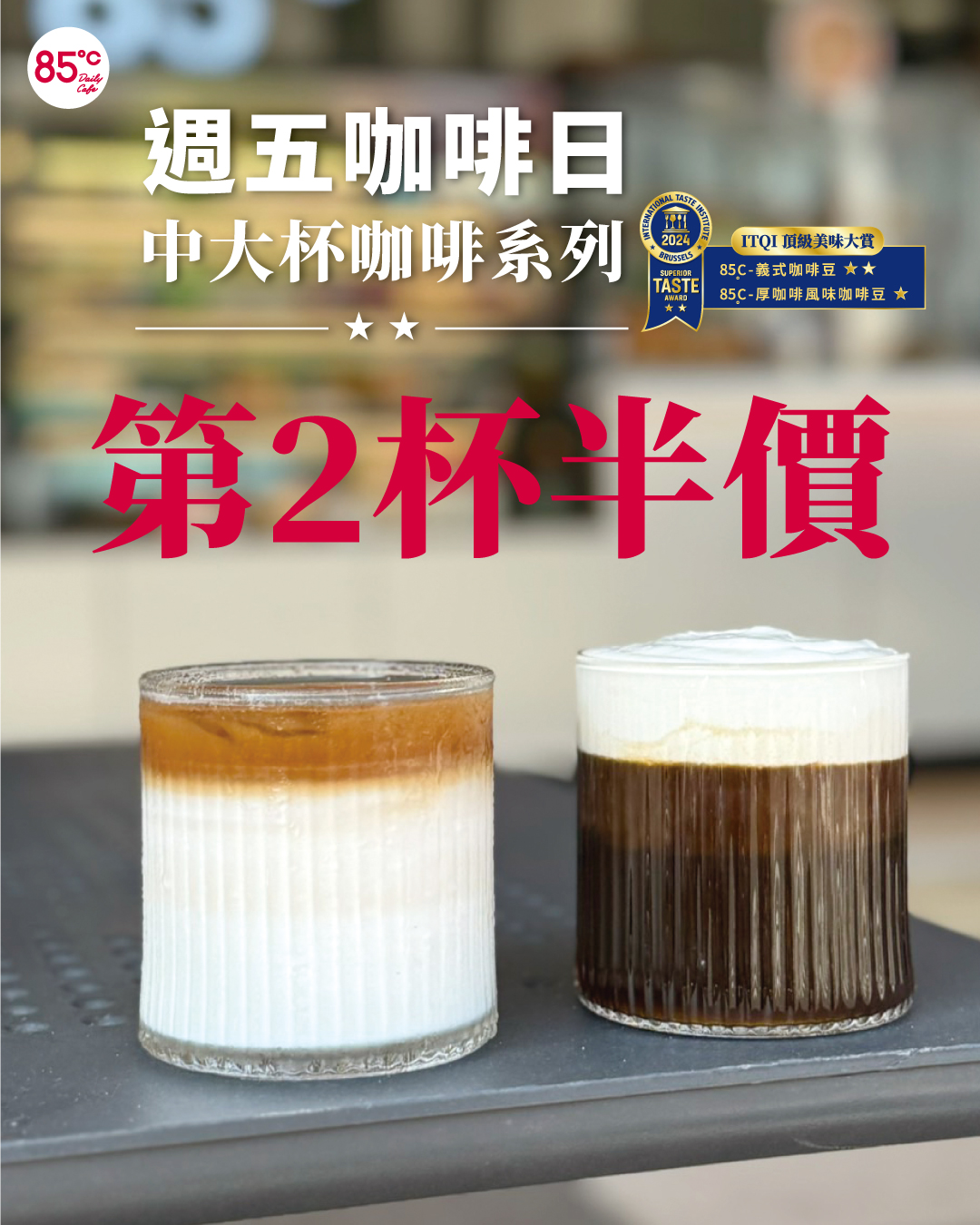 中大杯咖啡第2杯半價:85度C「週五咖啡日」,中大杯咖啡第2杯半價,限同品項同大小,限現場購買,外送及電話訂購不適用;寄杯辦法依各門市公告為主。
