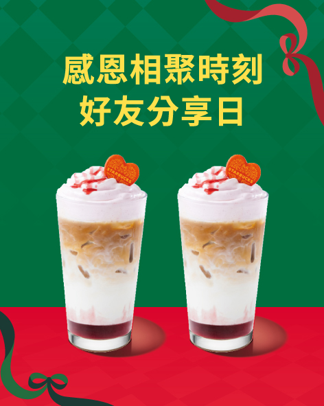 買1送1:星巴克「感恩相聚時刻好友分享日」,活動期間購買2杯大杯(含)以上容量/冰熱/口味皆一致的飲料,其中1杯由星巴克招待。每人每次至多買2送2,飲料限當場一次領取。