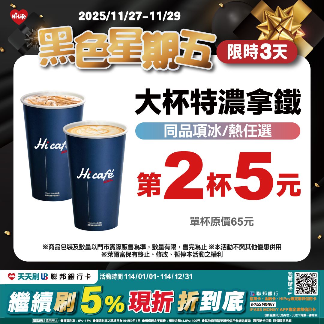 大杯濃萃美式買5送5,5折(原價50元、特價25元)