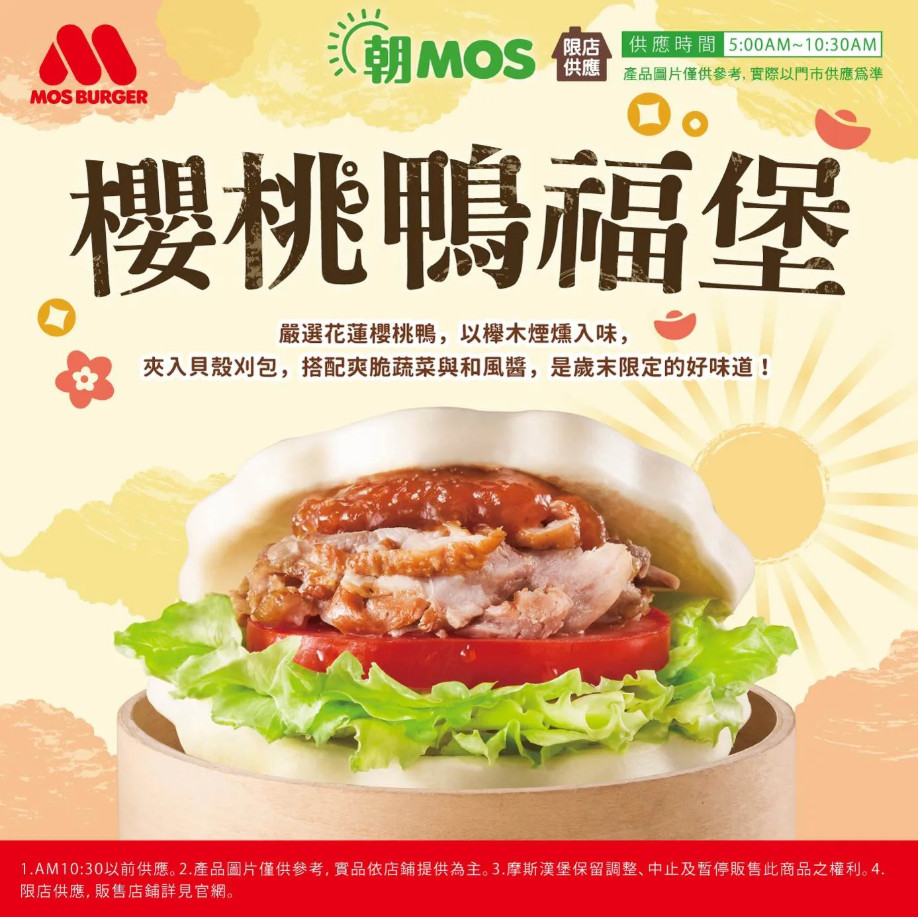 摩斯漢堡即日起推出一連串新品,必吃「櫻桃鴨福堡」,貝殼造型刈包夾入帶煙燻味的櫻桃鴨,肉質鮮嫩、皮Q彈,配上清爽萵苣和蕃茄片、洋蔥和風醬,讓人忍不住一口接一口!