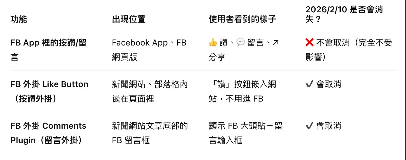 如果你曾經在新聞網站、部落格或購物頁面看到那個小小的「讚」拇指圖示,點一下就能同步分享到Facebook,那你大概參與過Web 2.0最繁華的年代。但風水輪流轉,Meta近期正式宣布:從2026年2月10日起,Facebook的「按讚」與「留言」外掛將全面退場。陪伴網站界超過十年的社交插件,終於在技術環境與法規變遷下,走向歷史舞台的另一端。