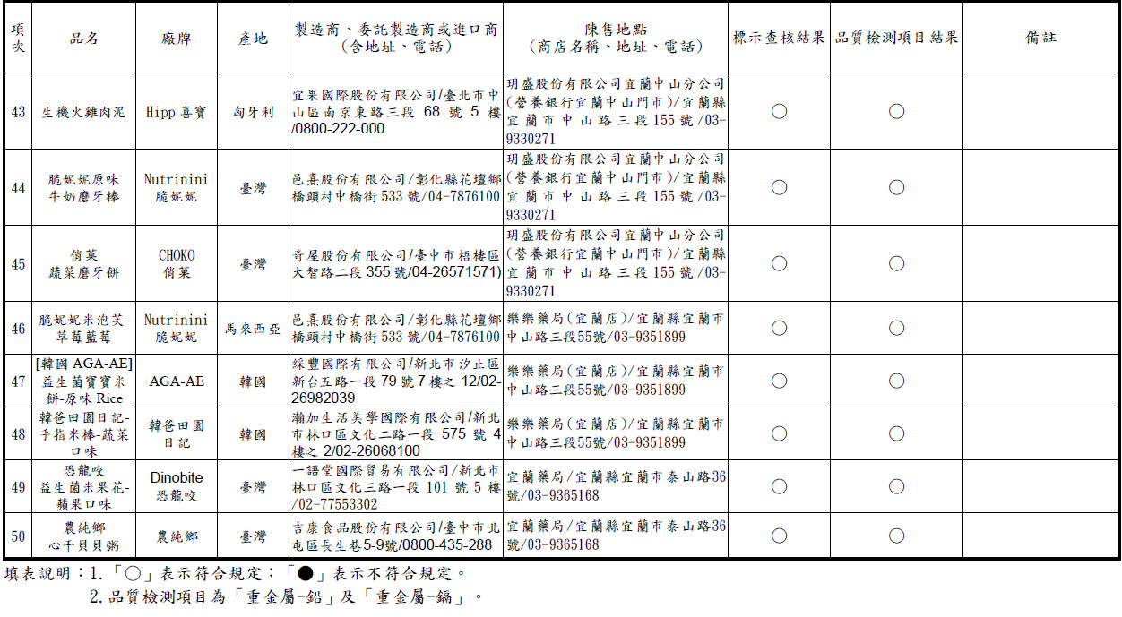 為守護嬰幼兒食品安全與消費者權益,行政院消費者保護處(消保處)針對市售50件市售嬰幼兒食品進行檢測及標示查核,其中標示查核部分全數符合規定;品質檢測部分,「重金屬-鉛」部分,有1件不符合規定,「重金屬-鎘」部分,有4件不符合規定,已由地方衛生機關依法查處並要求業者改善完畢。