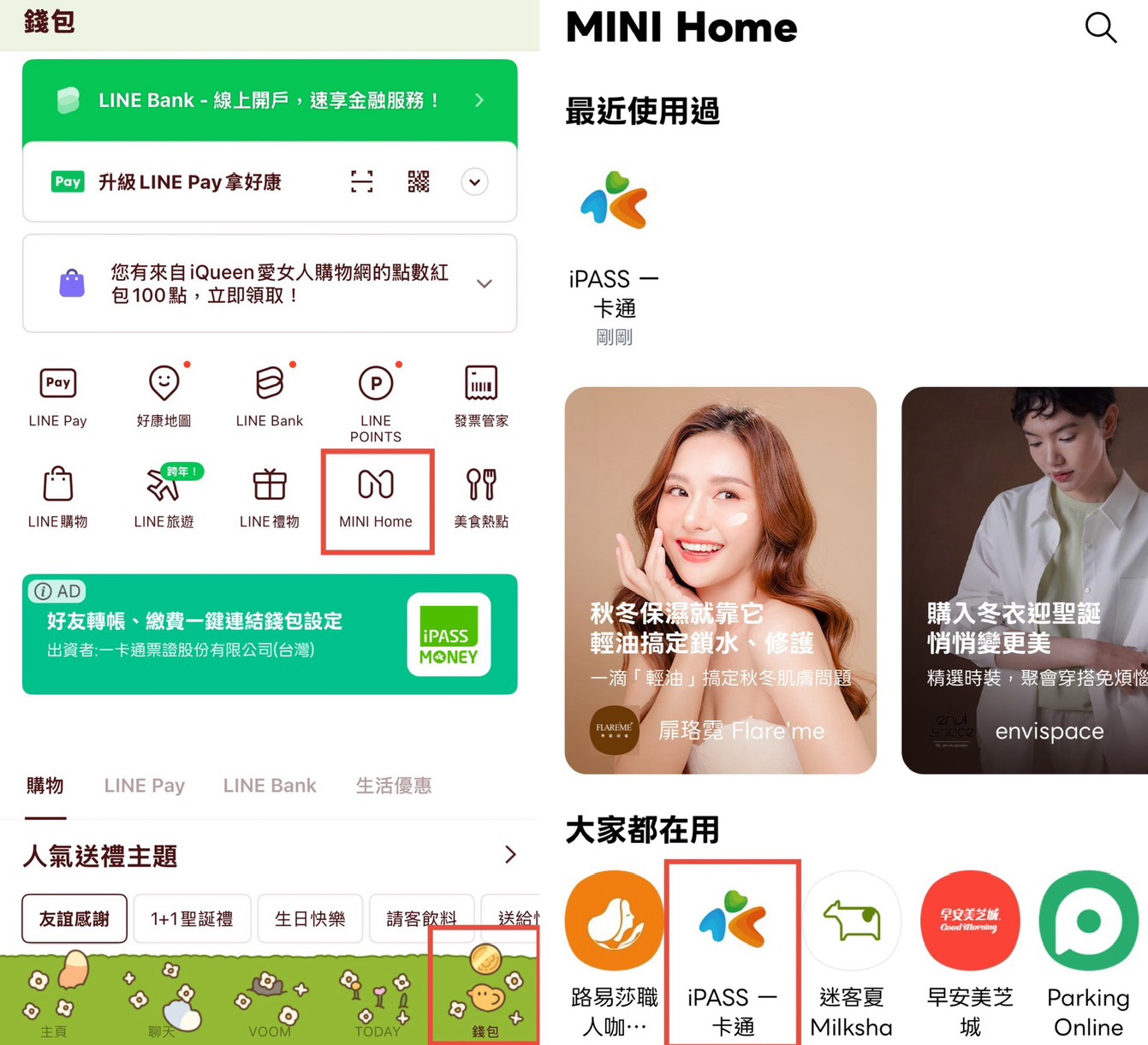 LINE MINI App是一個運行在LINE上的應用程式平台,和一般應用程式相比規模較小,用戶可以在LINE App裡的「錢包」選項中找到「MINI Home」,並且裡面可以找到iPASS一卡通的服務,只要遵循步驟完成帳號綁定,依舊能使用LINE好友轉帳功能,或是透過一卡通來完成水電、電信費的繳款。